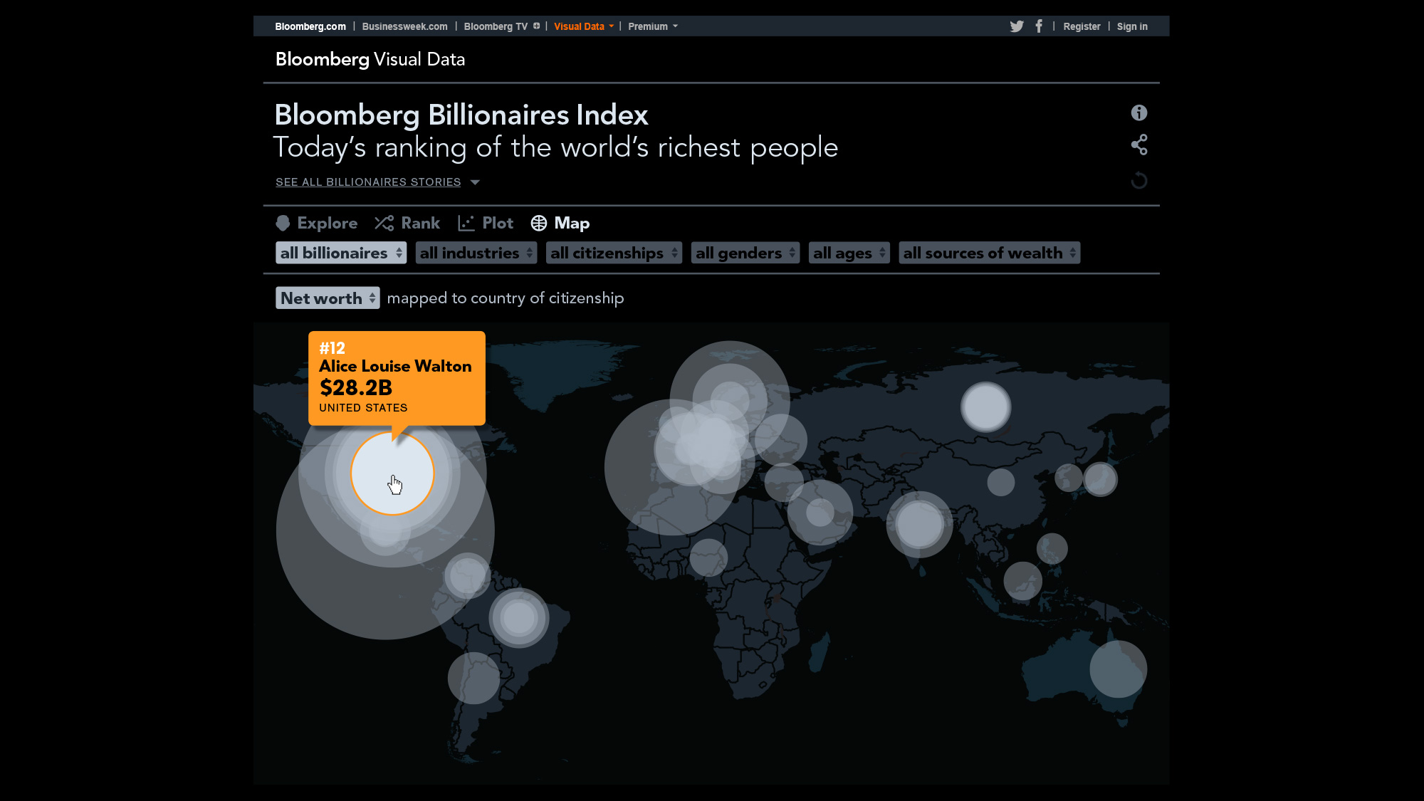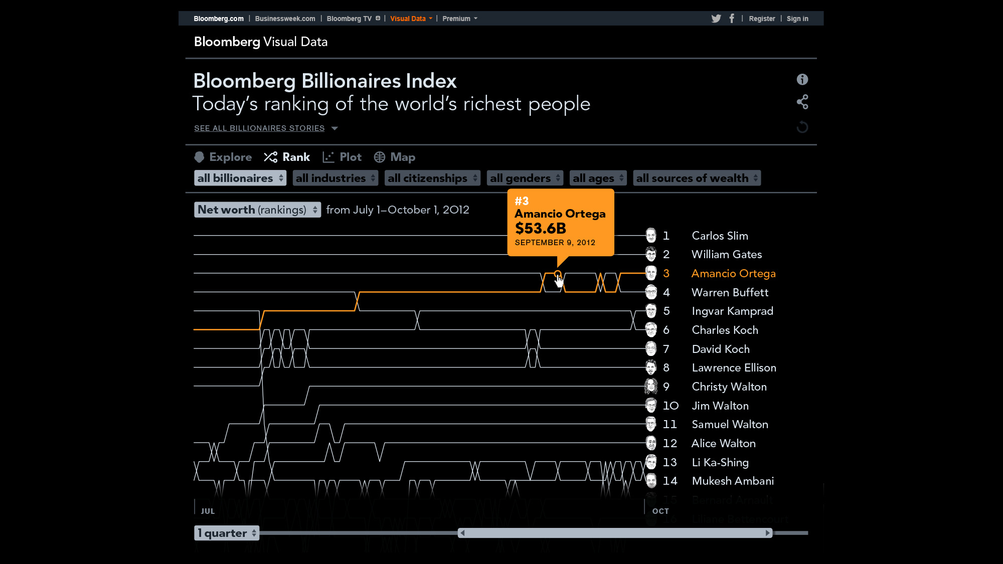 We (Bloomberg Visual Data) created an interactive data product that visualizes the wealth and ranking of billionaires over time and allows viewers to sort and filter by a number of parameters, including source of wealth, age, gender, and citizenship.
