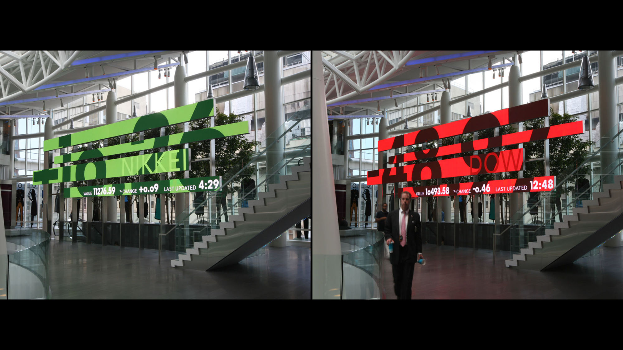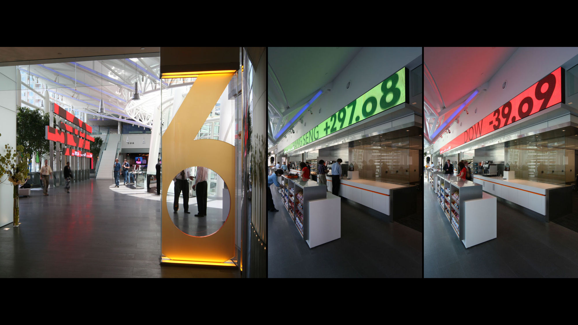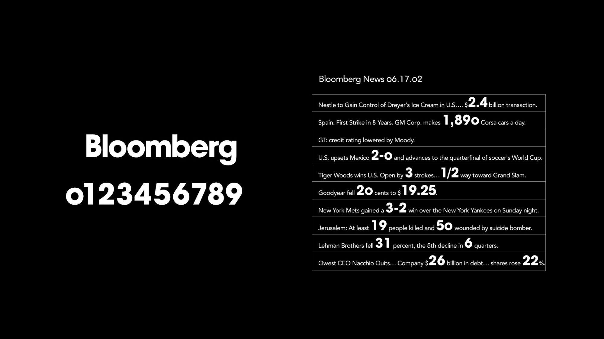 The work of both teams converged on a new numeric typeface based on the current (in 2001) Bloomberg logotype. The result was that the Bloomberg identity was carried throughout the space by static and dynamic numbers ranging from floors to dollars in Bloomberg’s own business news feeds.