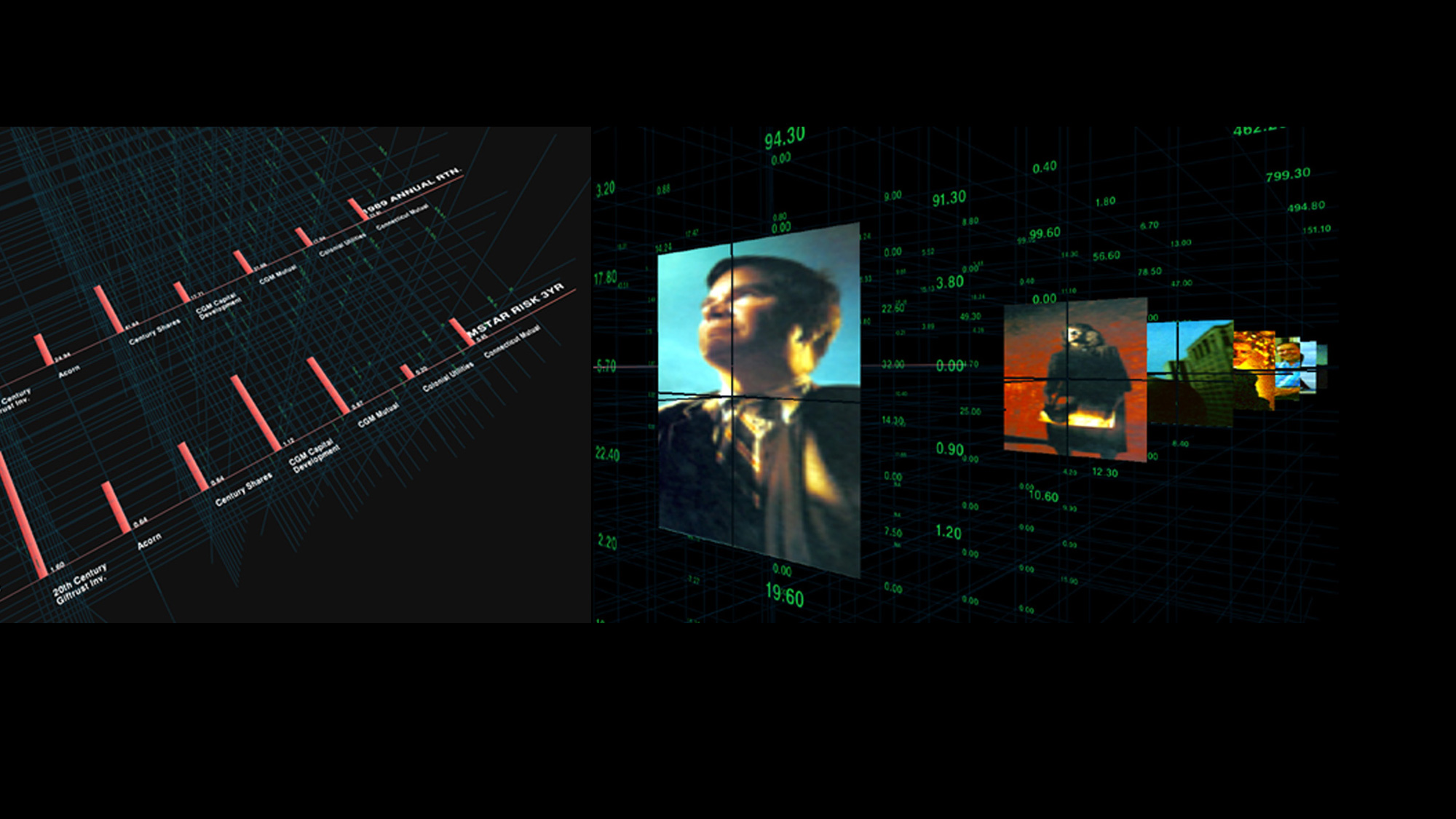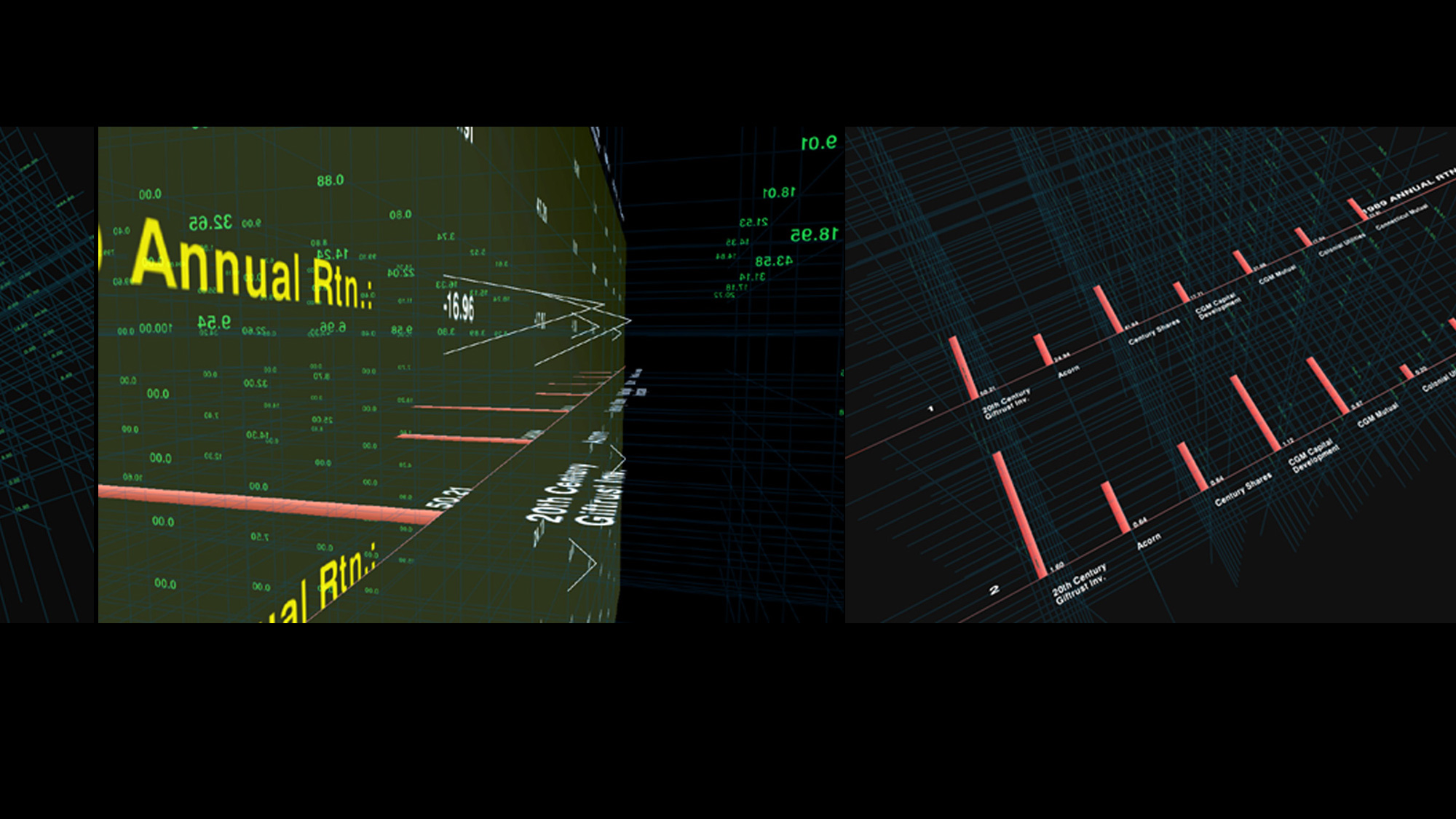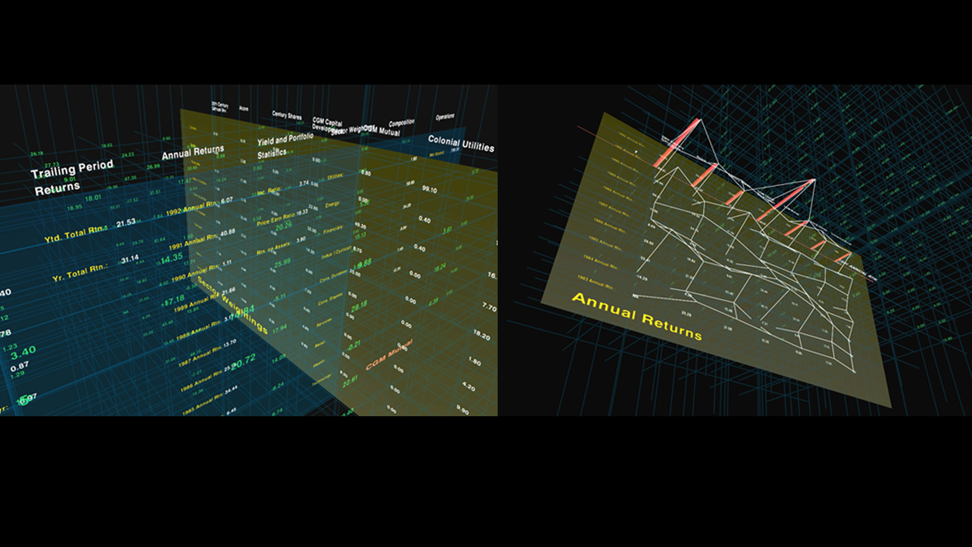 Financial Viewpoints visualized Morningstar mutual fund data as a 3D model. Seven mutual funds are presented as blue planes or sheets of data organized by 7 column categories. Each column category (such as annual return or a Morningstar risk rating) can be sliced by a yellow plane. The yellow plane allows viewers to compare all 7 funds by each category. Linear "slices" reveal bar charts. A topography of time-based annual returns suggests a portfolio view.