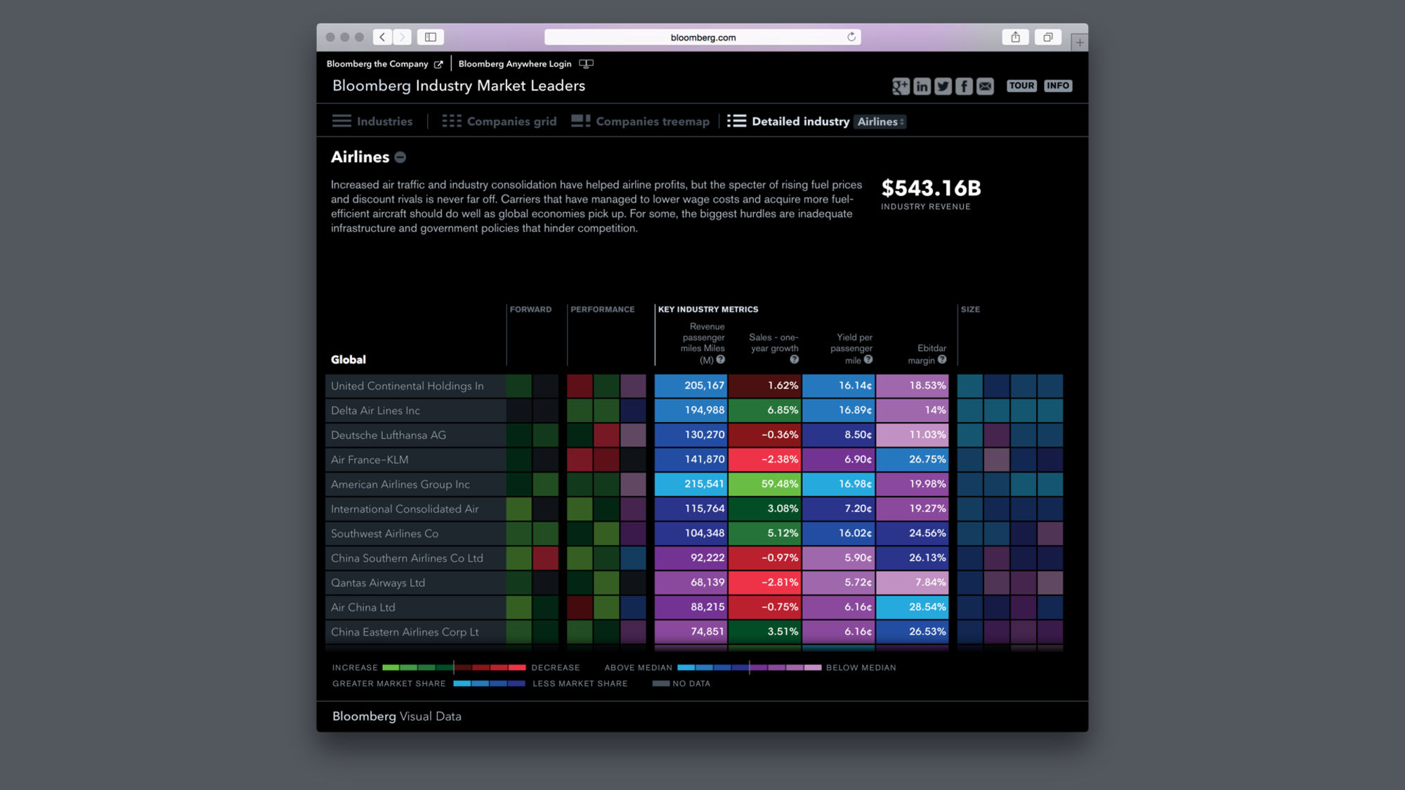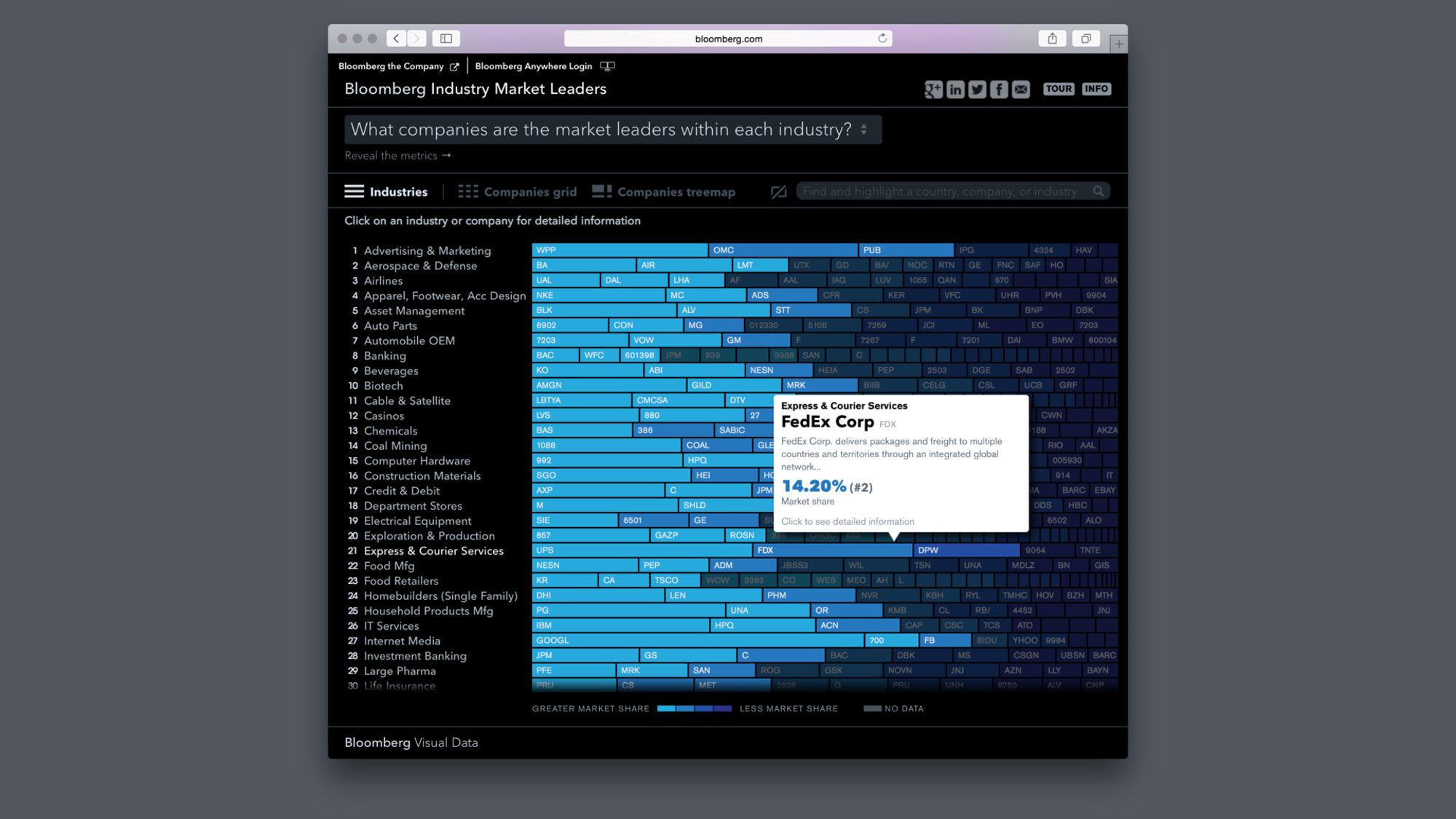 The Bloomberg Industry Leaderboard was developed as part of Bloomberg’s Year Ahead global franchise. This online tool visualizes 580 companies in 49 industries using traditional size, industry-specific, and proprietary forward-looking metrics. Data is updated daily, quarterly, and annually.
