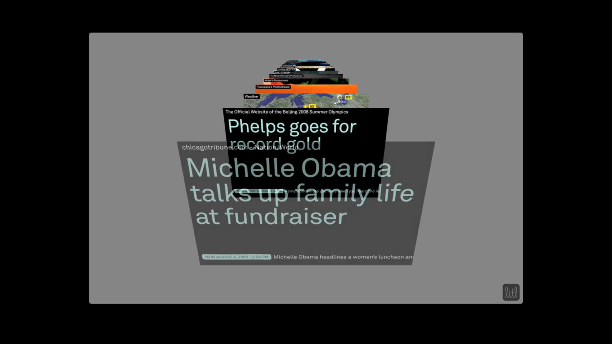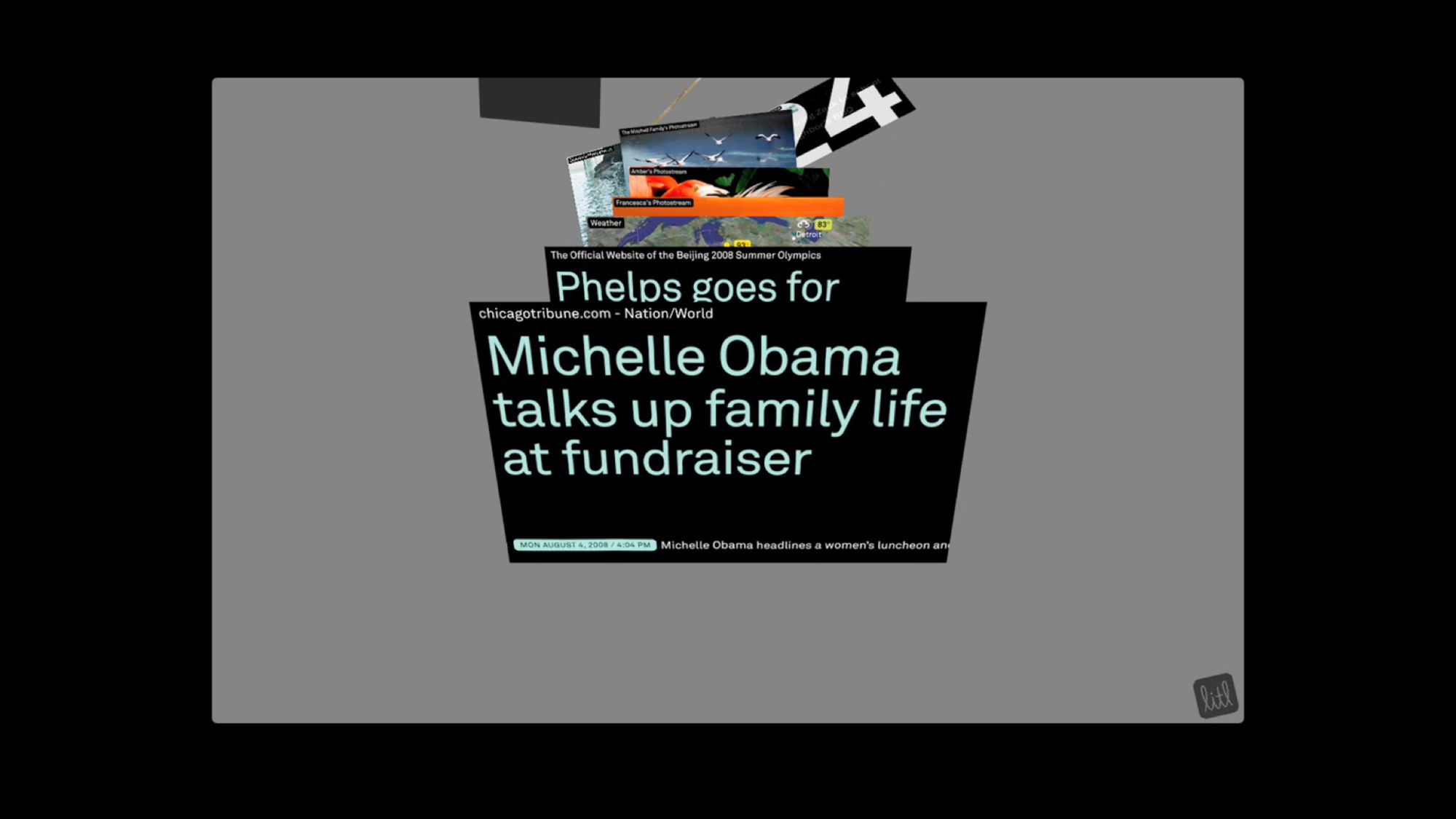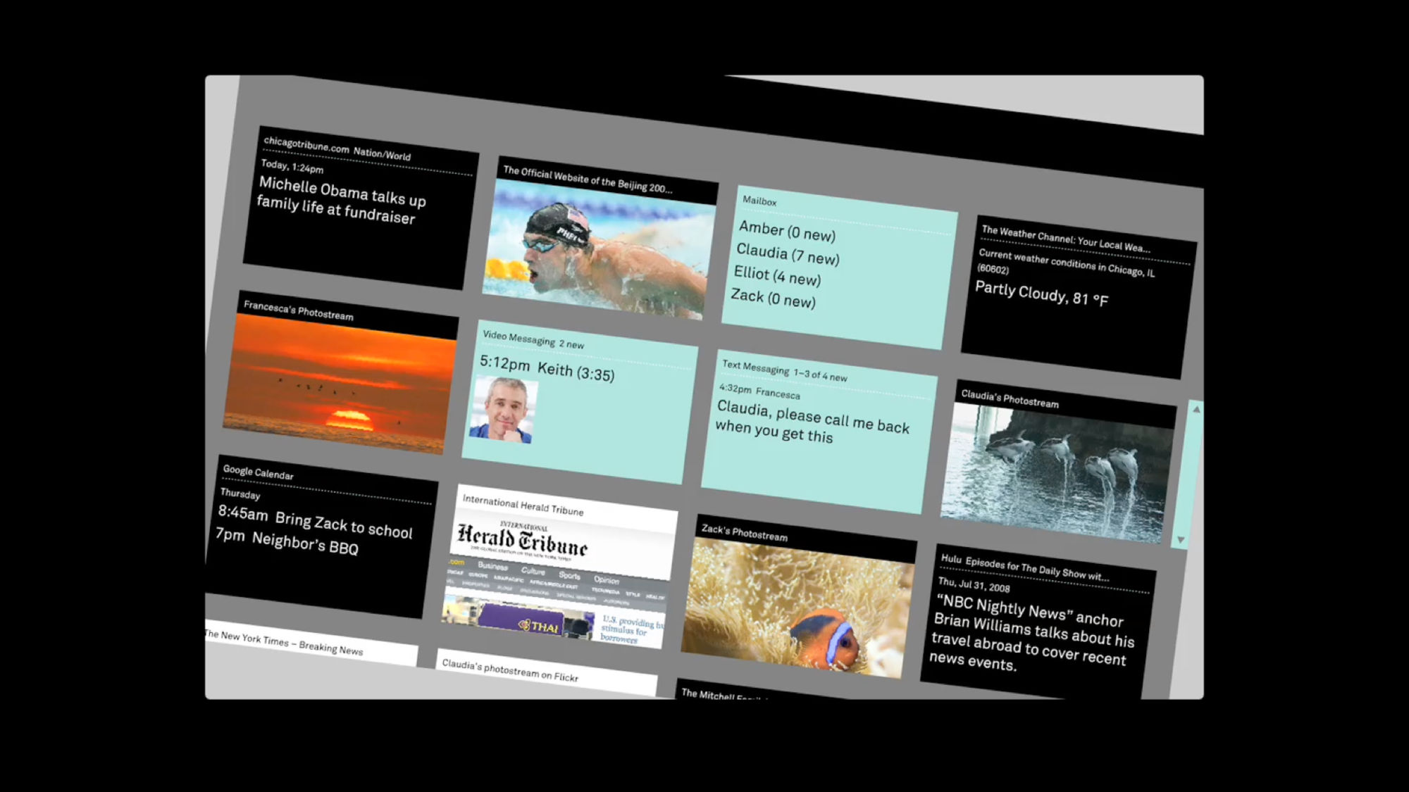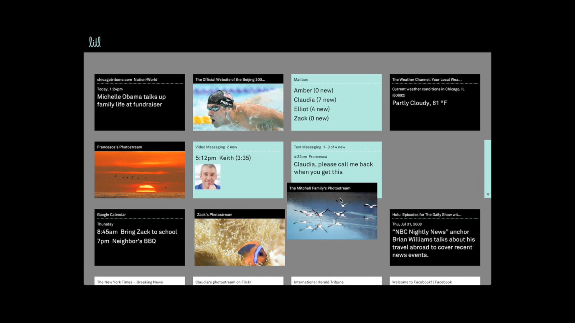 The Litl webbook can be used in two configurations: like a laptop to surf the Web, or flipped upright, like an easel, for broadcast of photos or videos. The user interface we designed is based on a series of “cards,” each functioning like a tab in an open browser window. In laptop mode, the cards can appear arranged on a screen like thumbnails, or opened up one at a time; in the easel/broadcast configuration, the cards appear as a rolodex stack and can be “tuned in” like a tv channel.