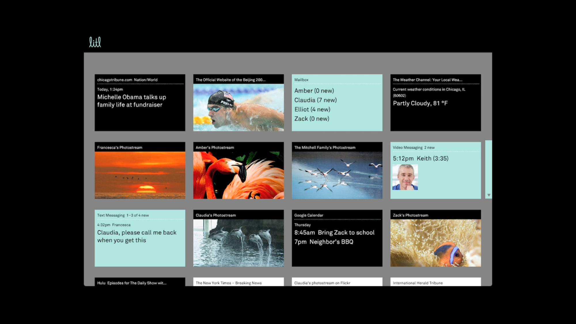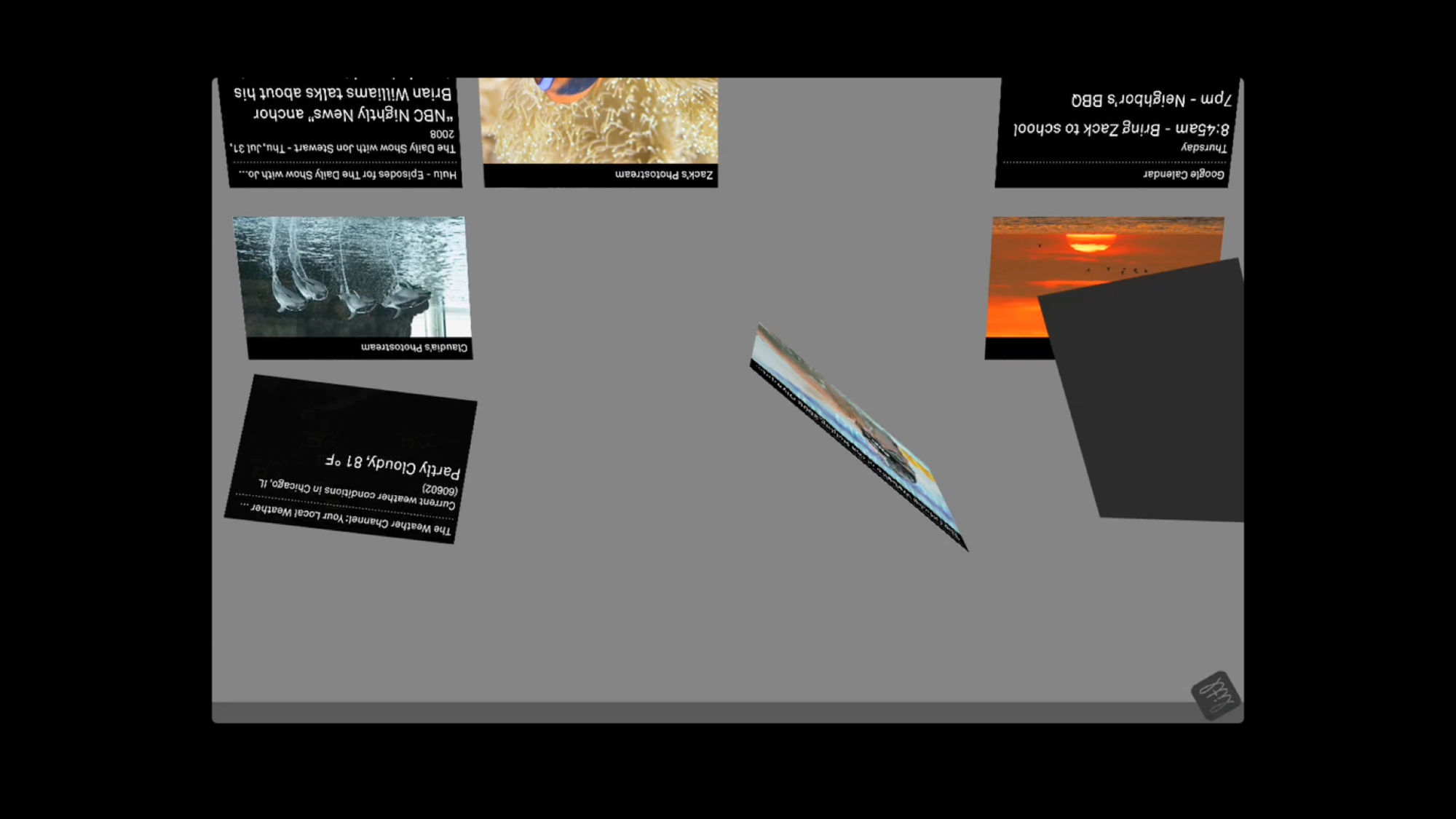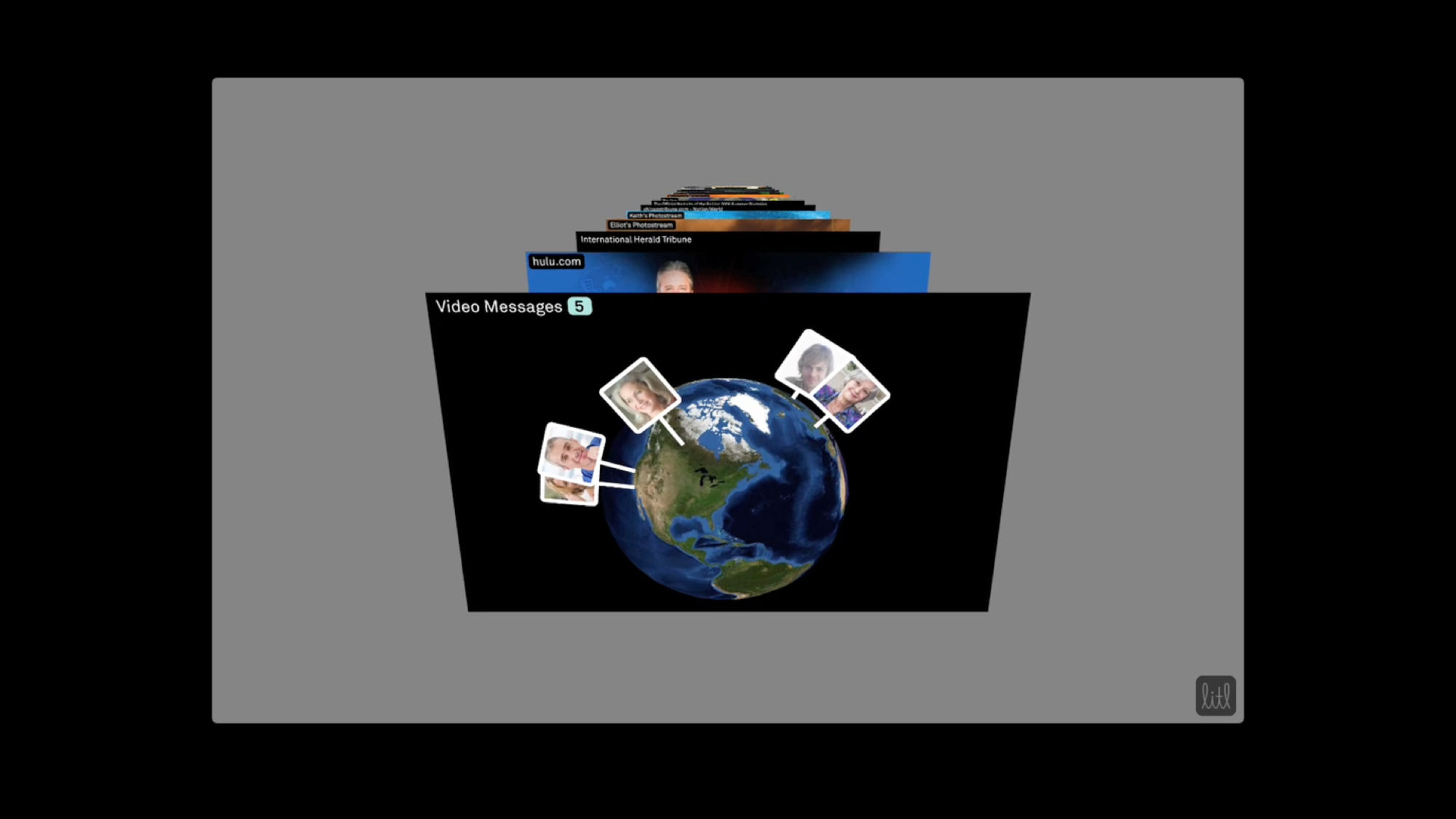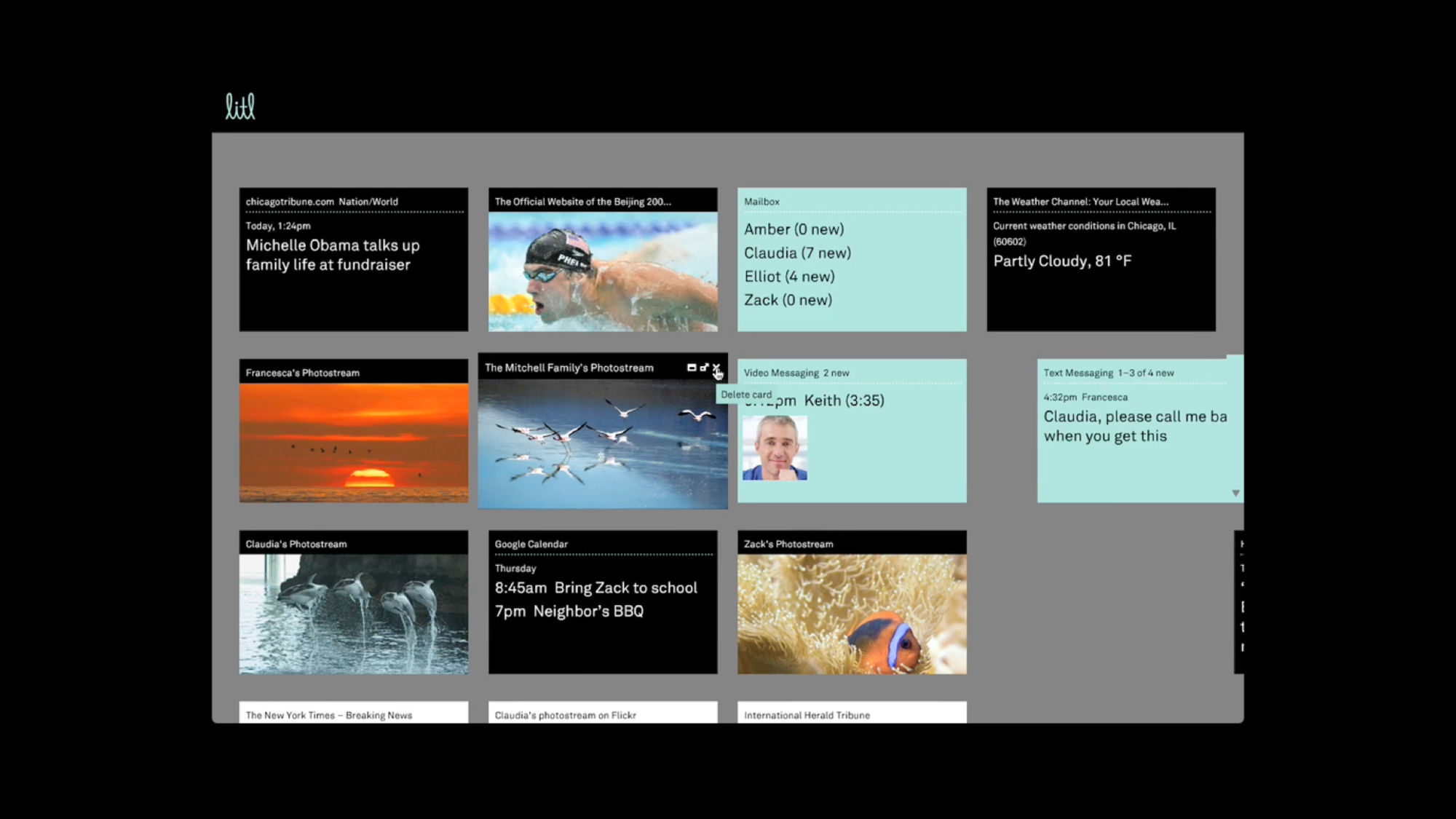 The Litl webbook can be used in two configurations: like a laptop to surf the Web, or flipped upright, like an easel, for broadcast of photos or videos. The user interface we designed is based on a series of “cards,” each functioning like a tab in an open browser window. In laptop mode, the cards can appear arranged on a screen like thumbnails, or opened up one at a time; in the easel/broadcast configuration, the cards appear as a rolodex stack and can be “tuned in” like a tv channel.