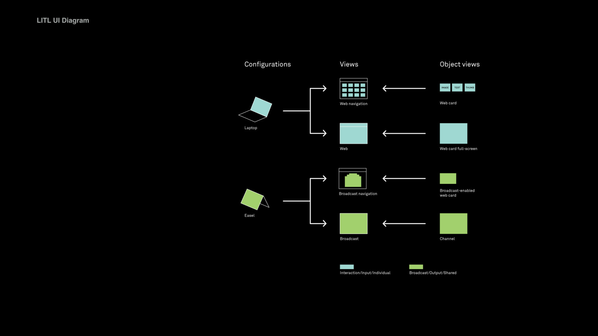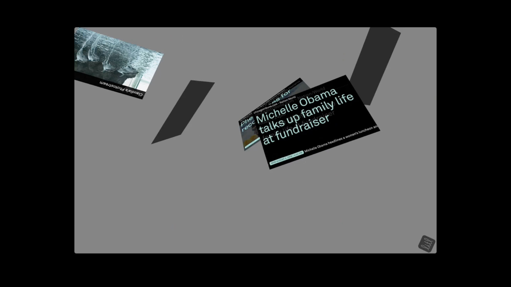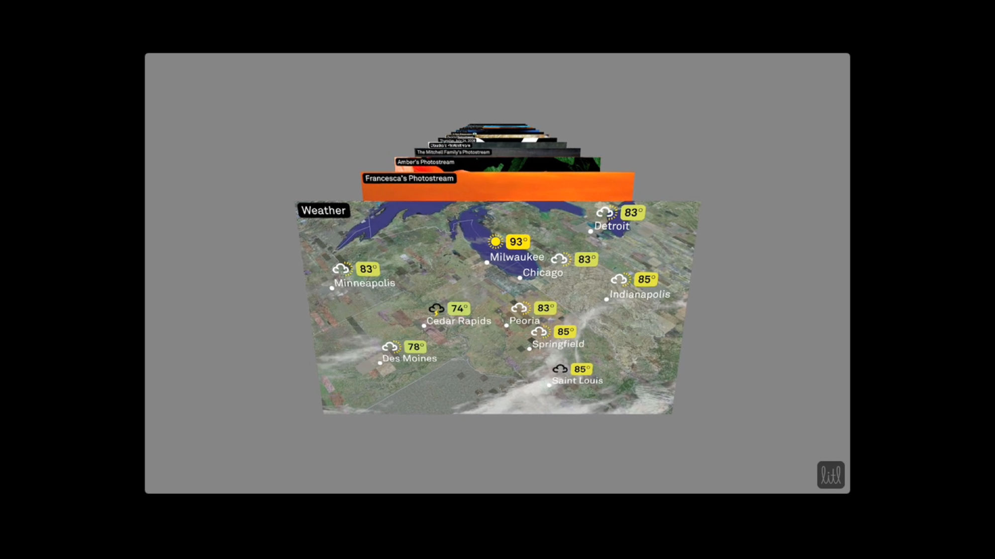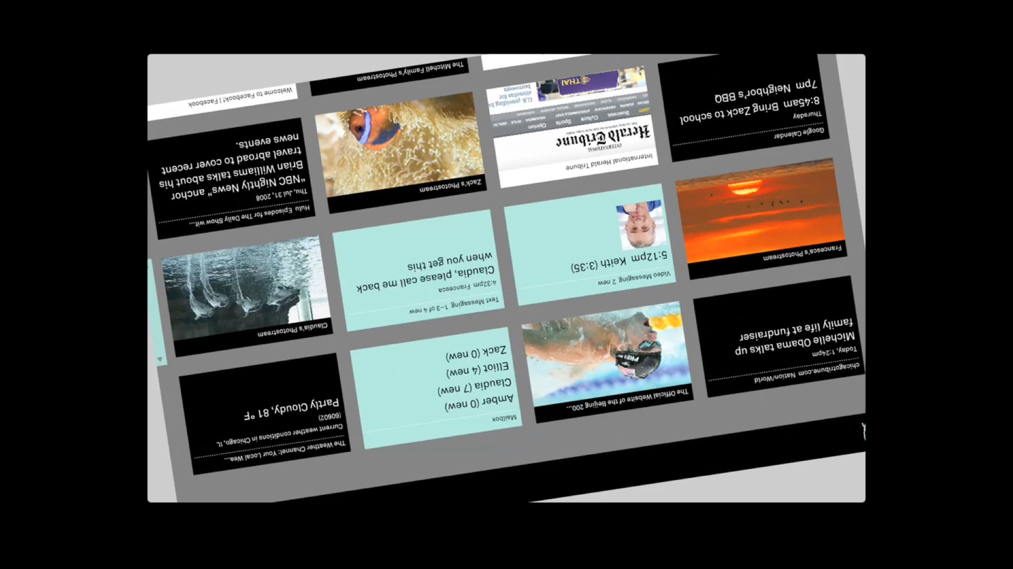 The Litl webbook can be used in two configurations: like a laptop to surf the Web, or flipped upright, like an easel, for broadcast of photos or videos. The user interface we designed is based on a series of “cards,” each functioning like a tab in an open browser window. In laptop mode, the cards can appear arranged on a screen like thumbnails, or opened up one at a time; in the easel/broadcast configuration, the cards appear as a rolodex stack and can be “tuned in” like a tv channel.
