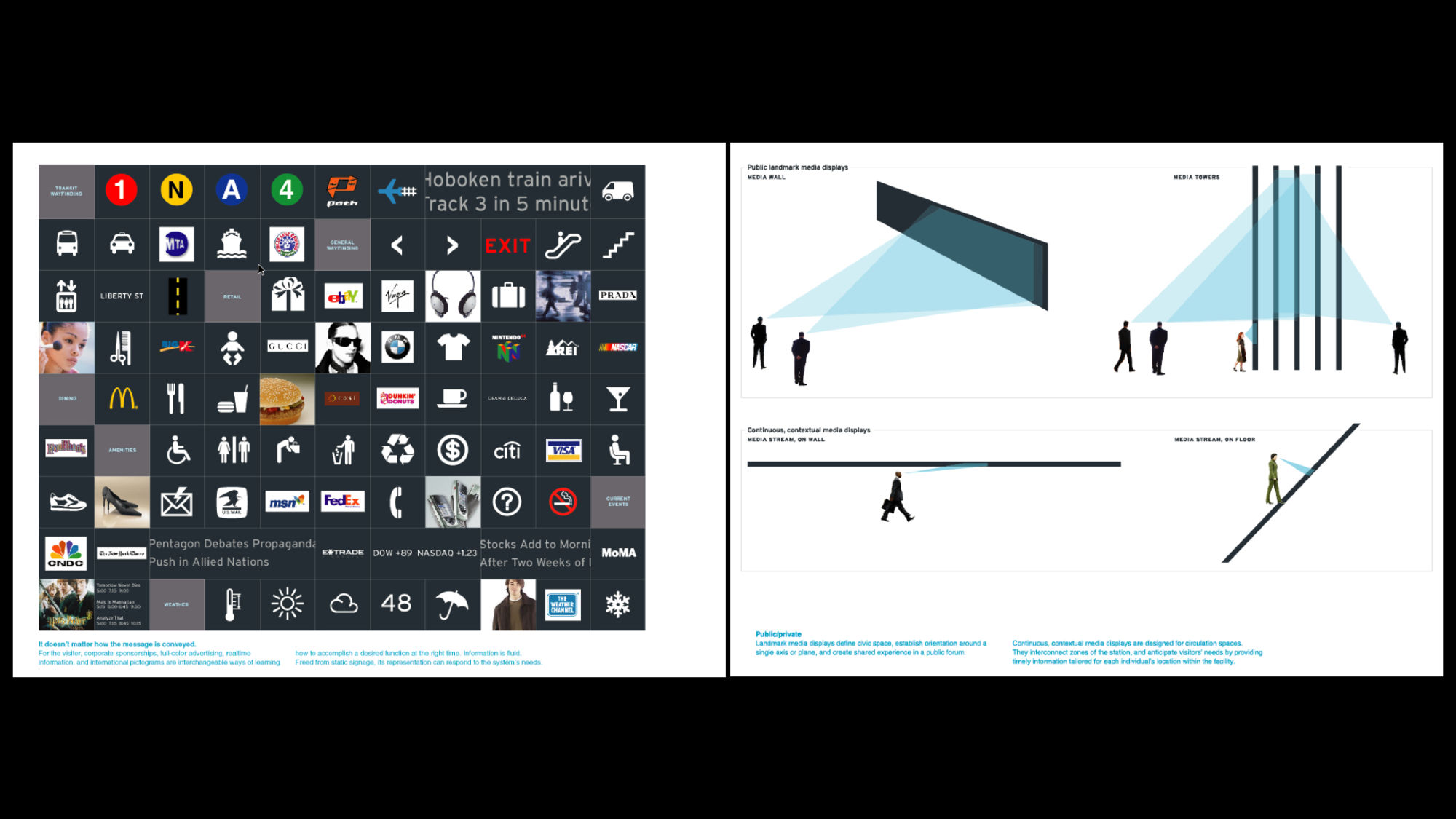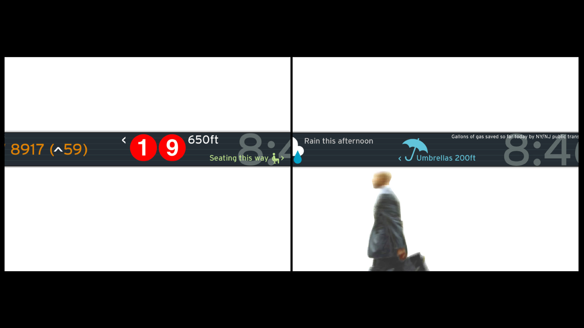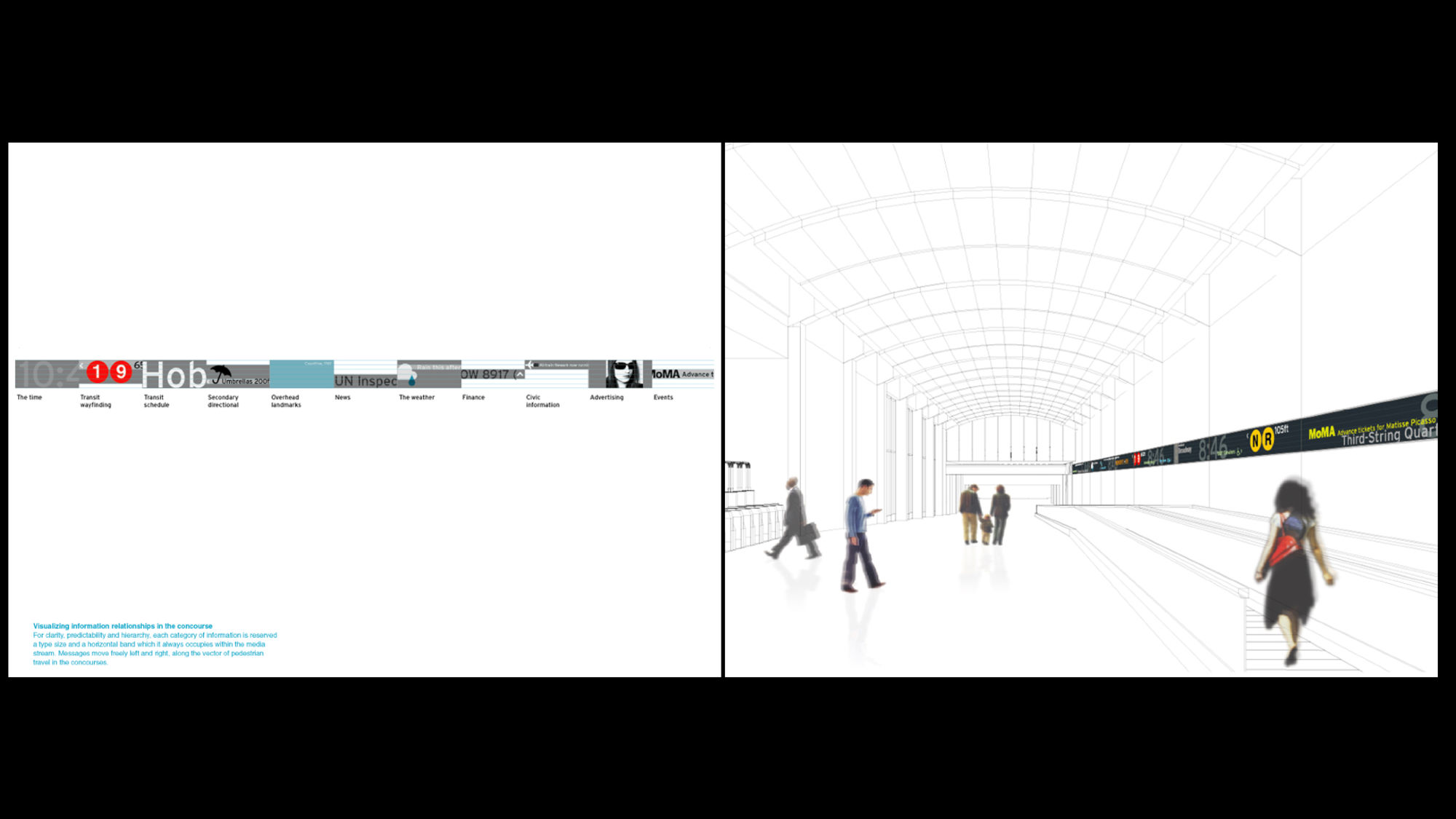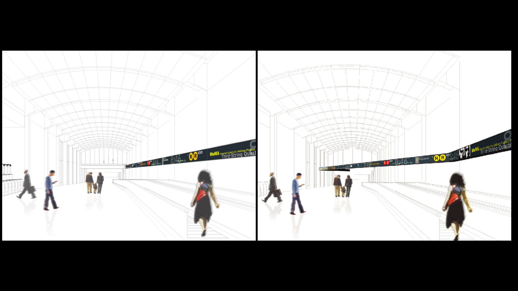 The Downtown PATH Station provided an opportunity to rethink the media form and experience. An 18 inch-wide media display was conceived to run through the long concourses of the station.