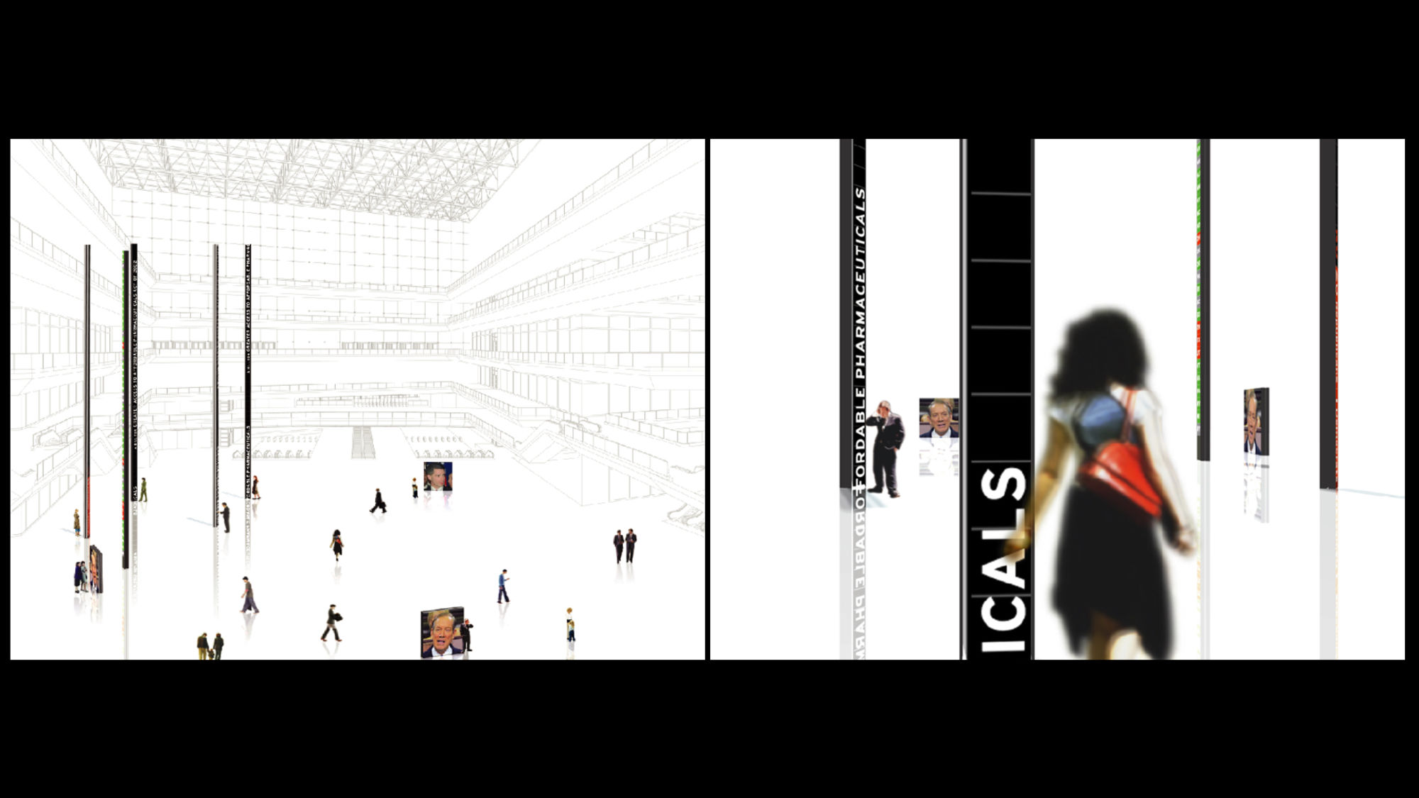 Interactive text and graphics on the stream accompany people walking through the space and anticipate their needs. The stream transforms into a grove of slim, 70 foot-high towers in the main terminal hall.